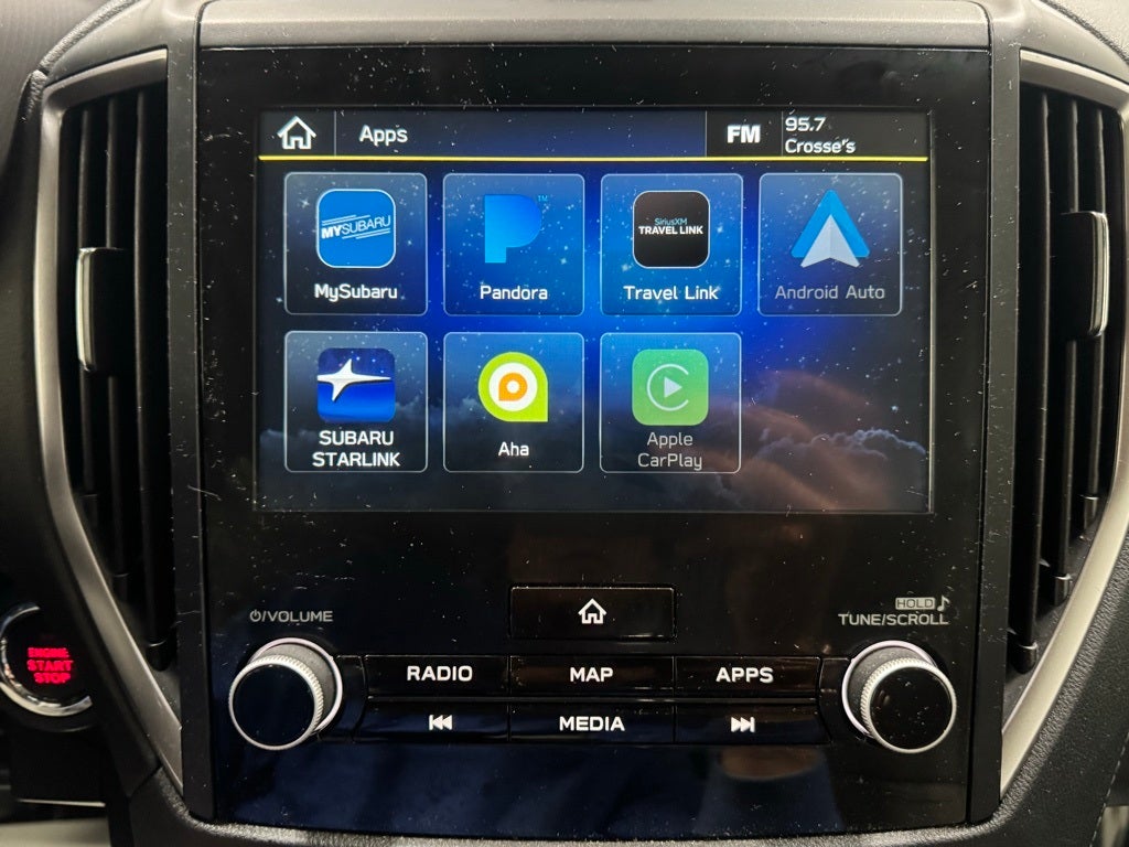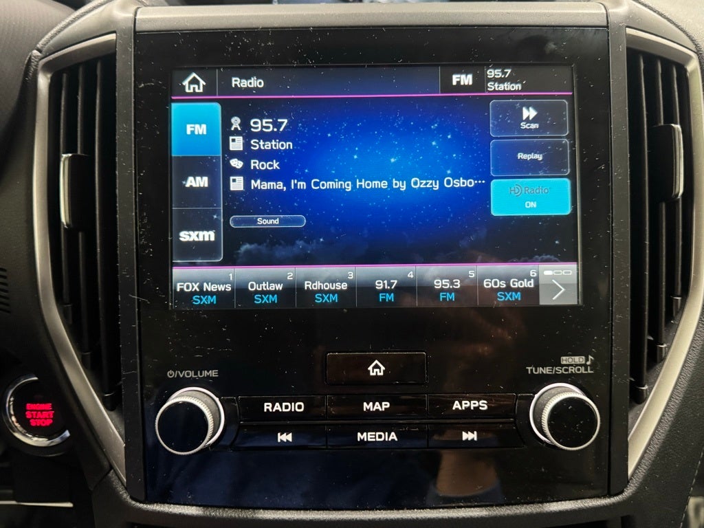 - Radio: Subaru STARLINK 8.0" Multimedia Plus System -inc: AM/FM stereo HD Radio, multi-touch gesture high resolution display screen, voice activated controls, Bluetooth® audio streaming, hands-free phone connectivity and hands-free SMS text messaging connectivity (refer to subaru.com for cell phone compatibility), Near Field Communication (NFC), iPod control capability, SiriusXM All Access radio and SiriusXM Travel Link (4 months free trial/subscription required after), smartphone integration for AHA, Android Auto, Apple CarPlay, Pandora and STARLINK cloud applications (refer to subaru.com for app availability), USB and Over The Air (OTA) audio system update, steering wheel controls for audio and Bluetooth®, 6 speakers, 3.5mm auxiliary input jack and dual USB A input/charge ports